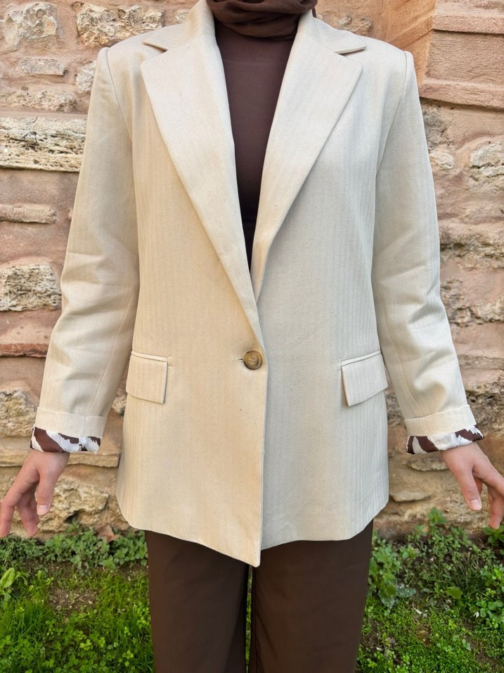 Düğmeli, bej keten kumaştan yapılmış kadın blazer.sıfır üründür etiketlidir