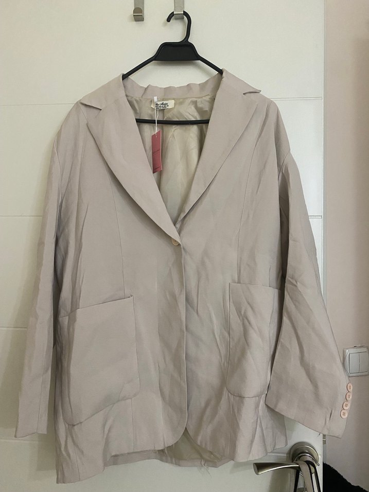 Bej renkli keten kumaştan, düğmeli, uzun kollu, normal midi boyda kadın blazer ceket. Ofis ve günlük şıklık için uygundur. Düz ve regular fit yapıda.