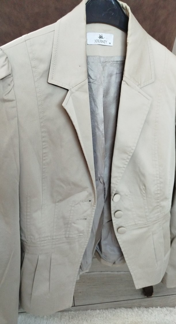 Bej keten kumaştan, düğmeli ve kesik yaka detaylı, midi boyda, uzun kollu kadın blazer ceket. Ofis ve günlük sokak stiline uygun.
