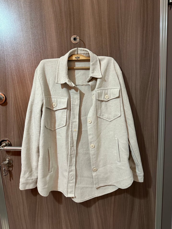 Düğmeli, uzun kollu, keten kumaştan bej renk kadın ceket. Salaş kesim, çıtçıtlı ve normal boyda, günlük kullanıma uygun.