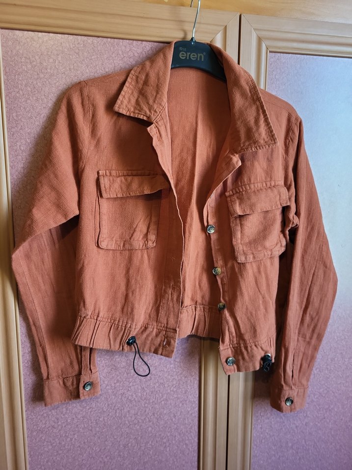 Düğmeli, uzun kollu, bej keten kadın ceket. Salaş kesimi ve notched yakasıyla günlük sokak tarzına uygun bir parça. ✨