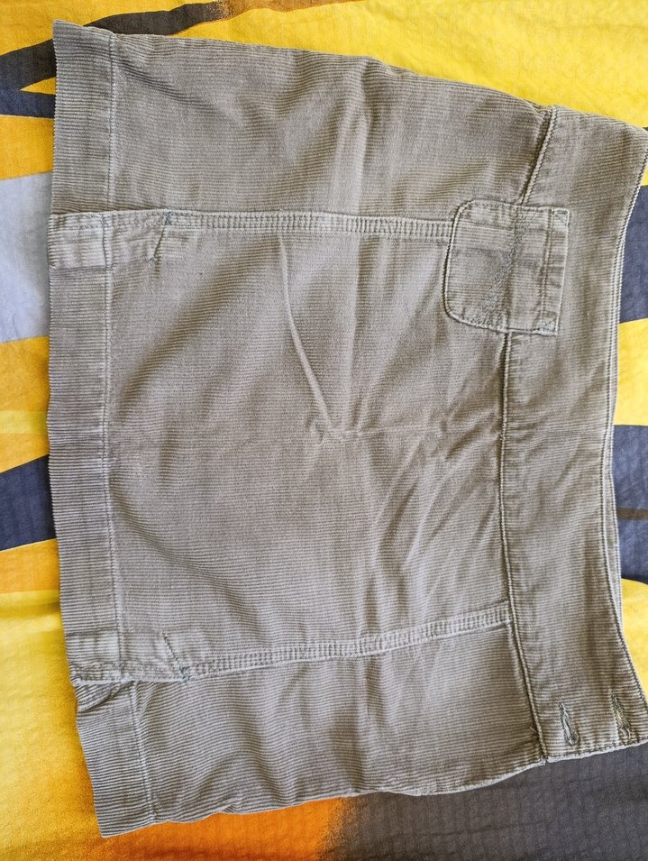 Düğmeli, keten kumaştan bej renkte, mini boy ve sade günlük kullanıma uygun etek, ön tarafta iki tane yırtmacı mevcut