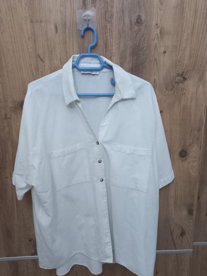 Düğmeli, kısa kollu, bej keten kumaştan yapılmış, bol kesim ve normal uzunlukta kadın gömleği. Günlük rahat kullanım için uygundur.