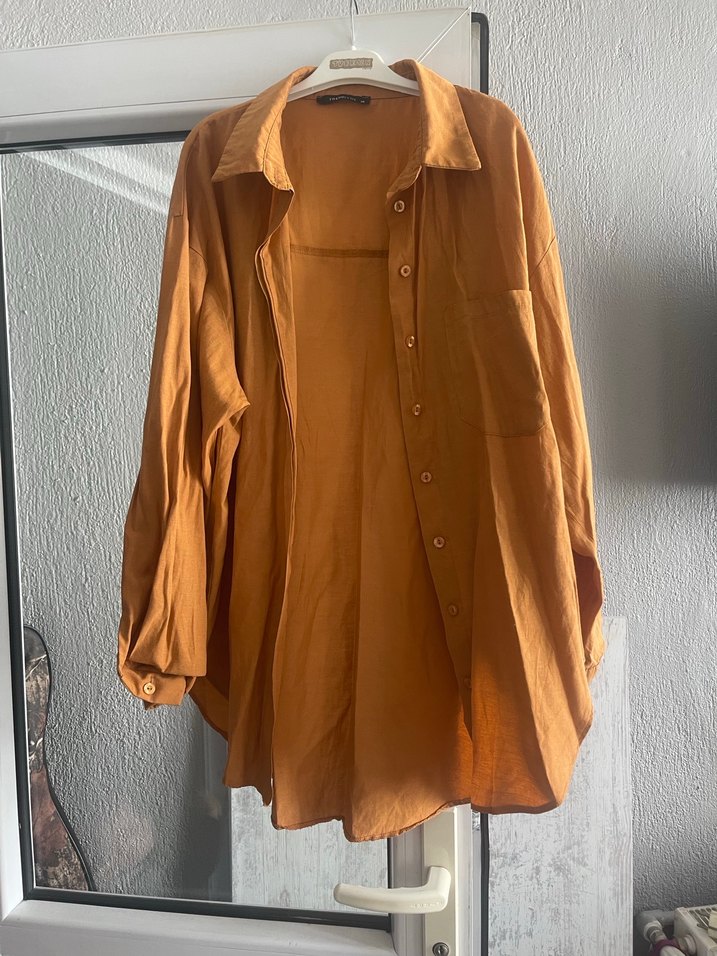 Düğmeli, uzun kollu, bej keten gömlek. Rahat kesimi ve notalı yaka detayıyla bohem tarzı sunar.