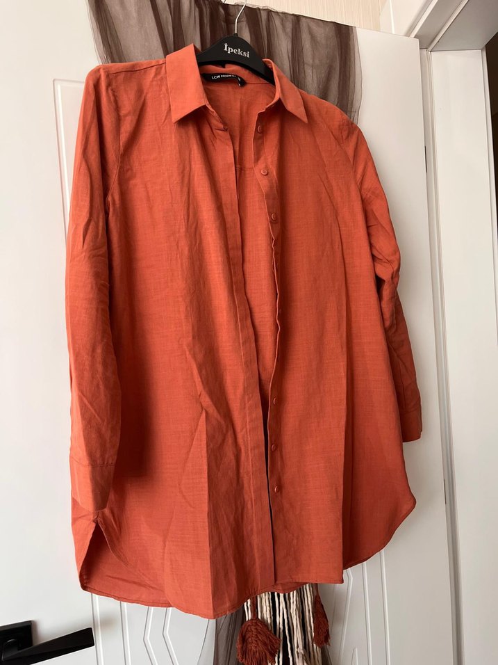Düğmeli, uzun kollu, yakalı bej keten gömlek. Rahat kesimi ve bohem tarzıyla günlük kullanıma uygundur.