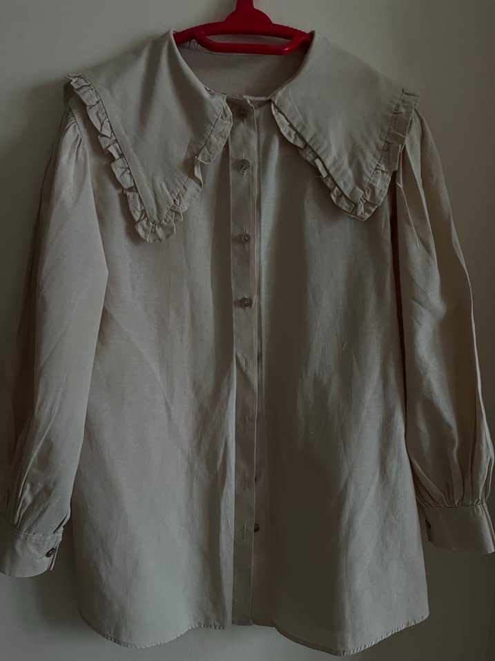 Bol kesim, büyük fırfırlı yakalı, uzun kollu bej keten gömlek. Düğmeli ve bohem tarzda, ofis kullanımı için uygun.