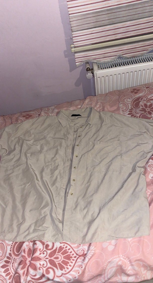 Düğmeli, kısa kollu, yakalı bej keten gömlek. Salaş kesimiyle rahat ve günlük kullanıma uygun.