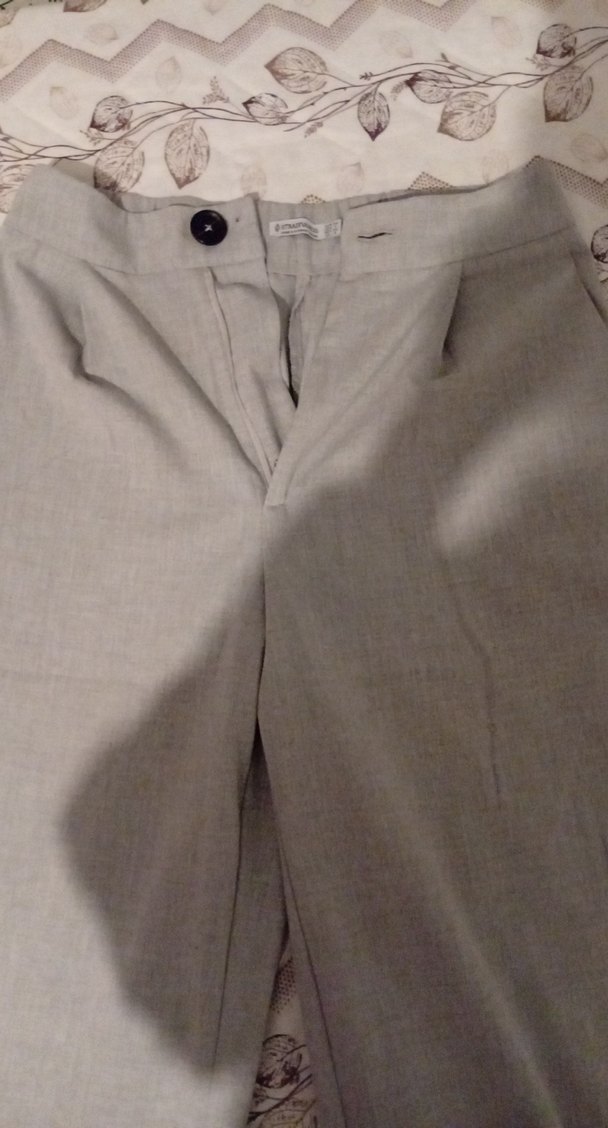 Ofis ortamına uygun, düğmeli ve düzenli kesim bej keten kumaş kadın pantolon.