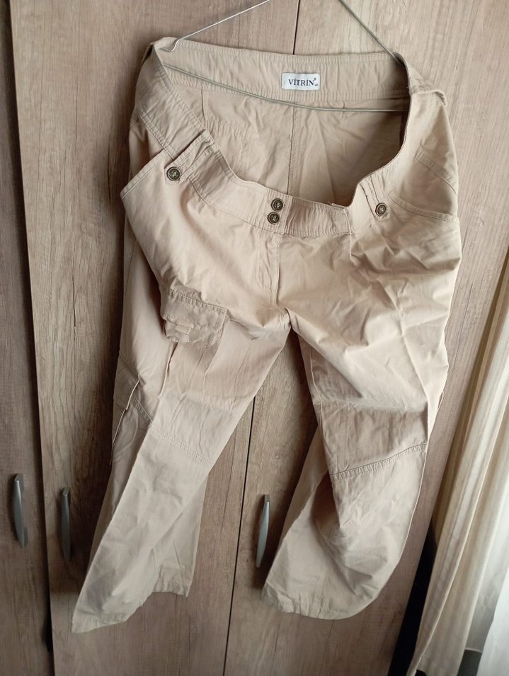 Düğmeli, bej keten pantolon, bol kesim ve midi boyda. Günlük kullanım için rahat ve pastel tonlarda, trend sokak stiliyle uyumlu.