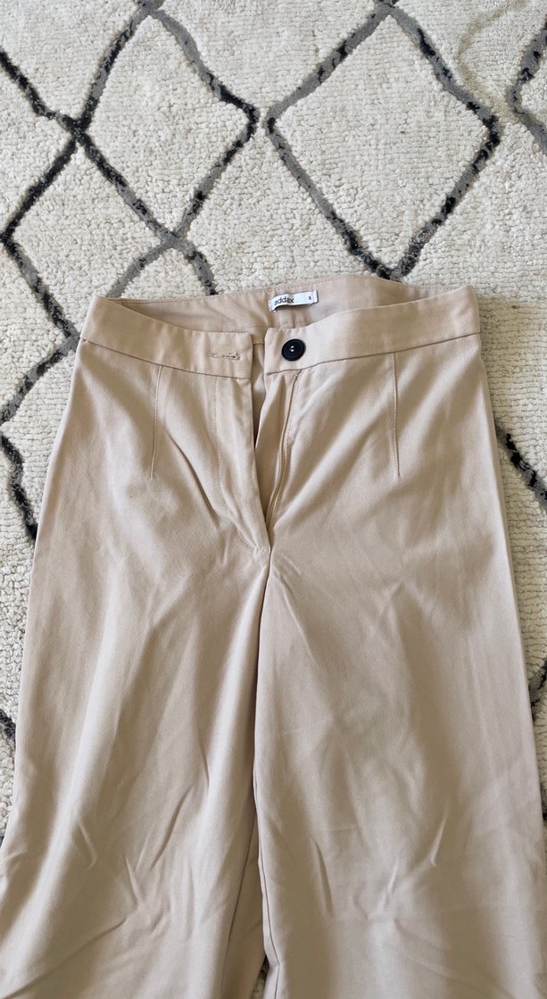 bej keten kadın pantolon, normal kesim ve midi boy. Minimalist ve normcore tarzıyla günlük kullanıma ve ofise uygun