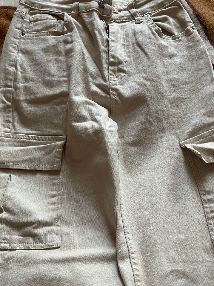 Düğmeli detaylara sahip bej keten pantolon, rahat ve bol kesimiyle günlük kullanıma uygun rahat bir stil sunar. Midi boyu normcore tarzını tamamlar. Bir kaç kere giyilmiştir defosu yoktur