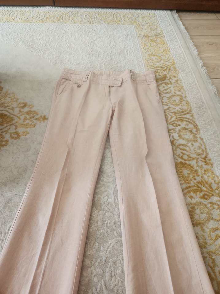 Düğmeli, bej keten pantolon, normal boy midi kesim, rahat ve desen içermeyen tasarım, ofis kullanımı için uygundur.