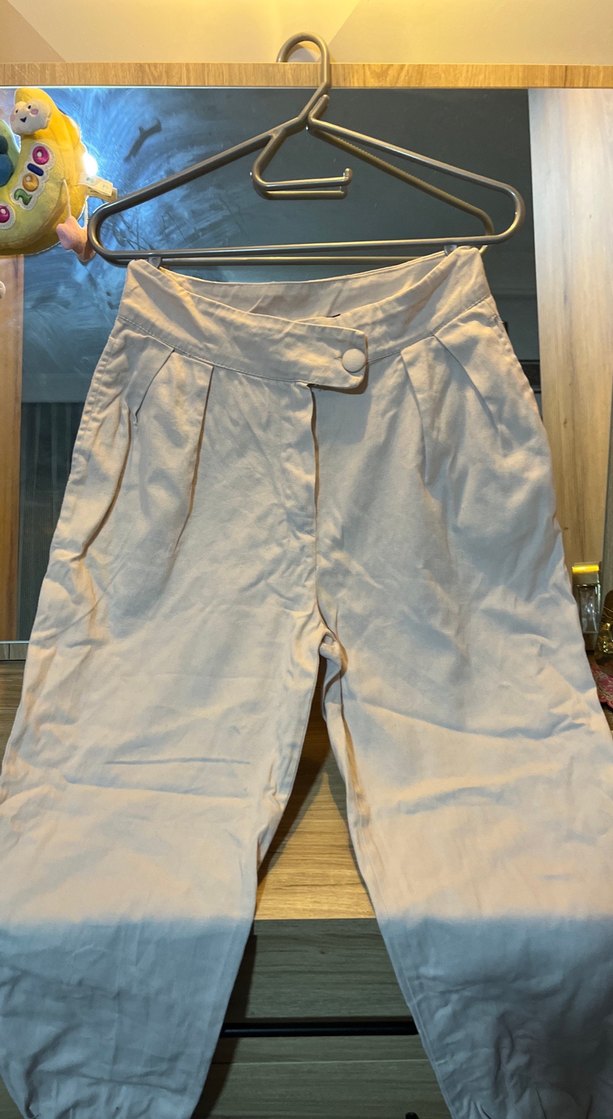 Düğmeli bel, bol kesim bej keten kadın pantolon, gündelik kullanıma uygun sade tasarım. M bedenede uyar.