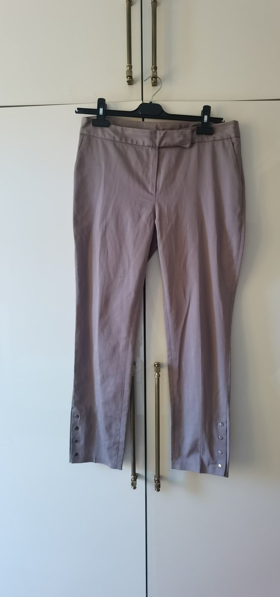 Düğmeli detaylı, normal boy midi kesim, bej keten kadın pantolon, rahat kesim. Ofis kullanımı için uygun, şık ve sade tasarım. 38 beden Selen marka pantolon