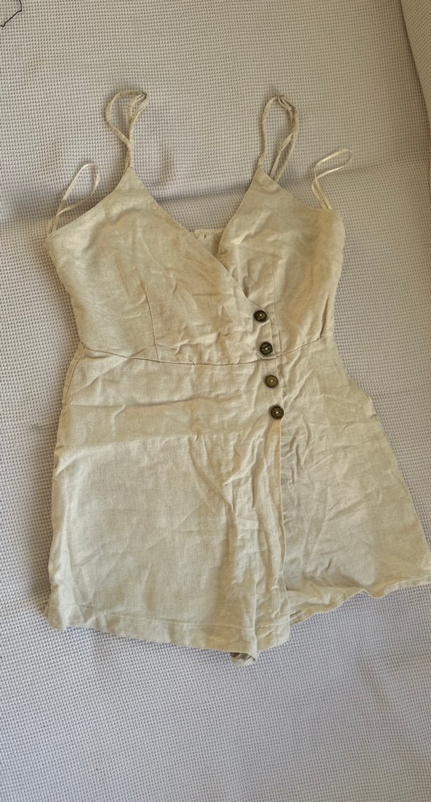 Bej renkli keten kumaştan, düğmeli ve V yakalı, kolsuz, midi boyda kadın tulumu. Bohem ve vintage tarzına uygundur. Etiket kısmında sadece defosu vardir onun harici kusursuz. Sadece 1 kez giyildi