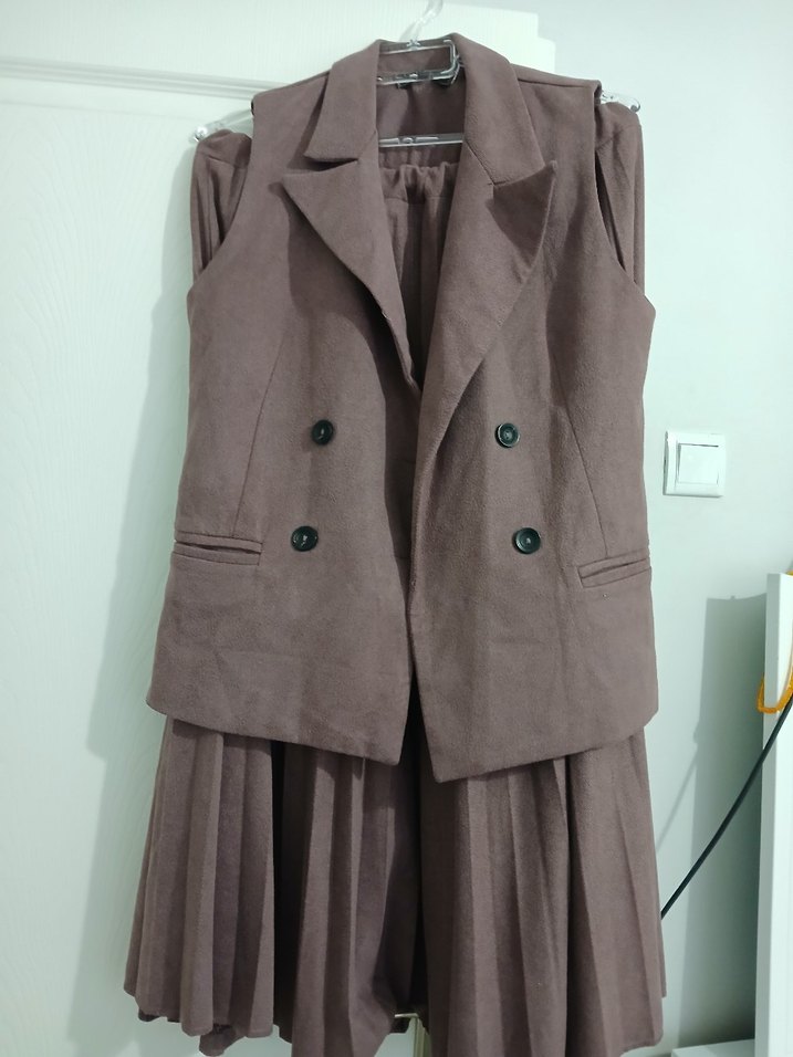 Bej renkli, keten kumaştan yapılmış, düğmeli, yakalı ve kolsuz kadın uzun ceket. Ofis kullanımı için uygundur.çok talep geldi 450 olsun diye tamam ramazana özel 450 olsun
