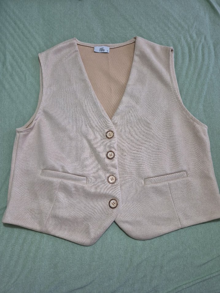 Düğmeli ve şal yaka detaylı, keten kumaştan yapılmış bej renkli, regular fit kadın yelek. Günlük sokak stili için uygundur.