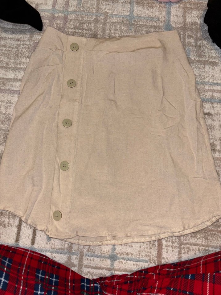 Bej keten midi etek, düğmeli ve bol kesimdir. Rahat ve bohem tarzıyla günlük kullanıma uygundur.