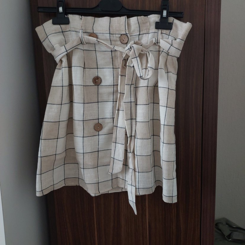 Bej keten düğmeli ve bağcıklı, bol kesim ve gri kareli desene sahip, rahat ve bohem tarzda kısa etek.