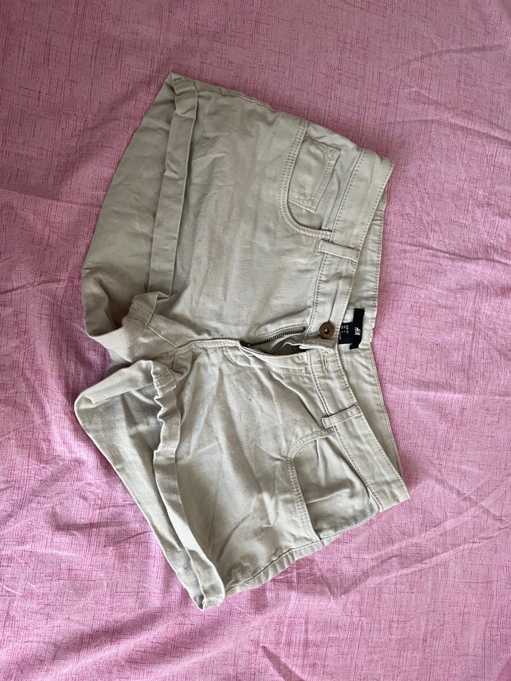 Nefes alabilen keten kumaştan yapılmış, düğmeli ve sade desensiz bej mini şort. Rahat ve şık, günlük dış mekan kullanımı için uygundur.
