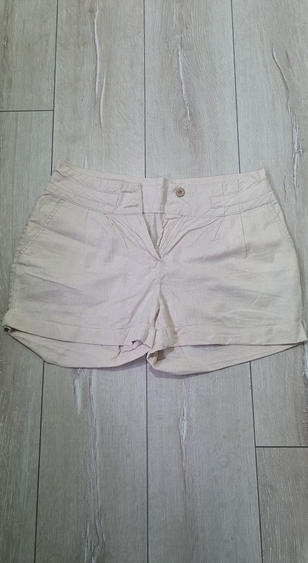 Yumuşak keten kumaştan, düğmeli, bol kesim bej mini şort. Rahat ve sokak stiline uygun, dış mekan kullanımı için ideal.