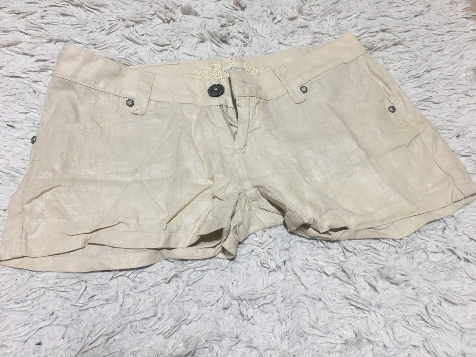 Düğmeli, bol kesim, bej keten mini şort, günlük rahat kullanım için uygundur.