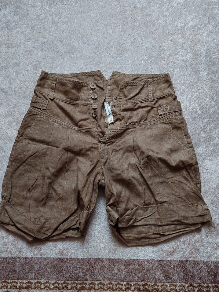 Düğmeli ön kısmı ve bol kesimiyle bej keten şort çok rahat ve şık. 2 düğmesi yok o yuzden cok uyguna koyuyorum baska hicbir hatası yoktur. m beden 42 44 beden icin uygundur. kesimi bol çünkü