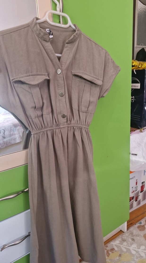 Düğmeli, kısa kollu, V yakalı bej keten uzun elbise. Rahat kesimi ve ön cep detaylarıyla gündelik kullanıma uygun.