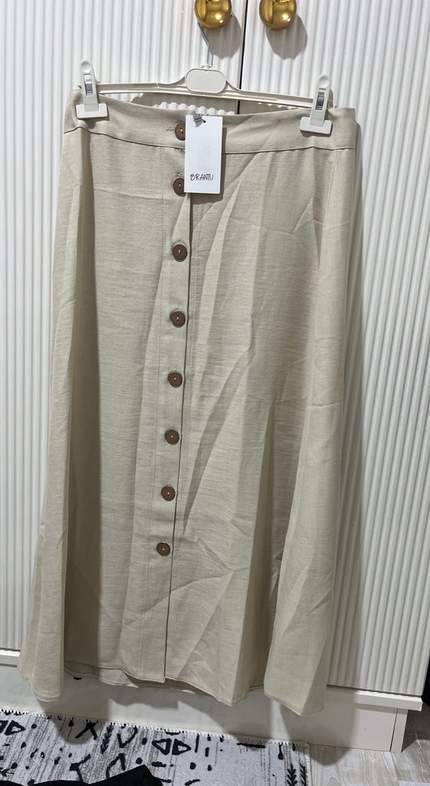 Bej keten uzun etek, düğmeli ön detay ve bol kesimiyle minimalist bohem tarzını yansıtır, günlük kullanıma uygundur. Hiç giyilmedi sıfır ürün