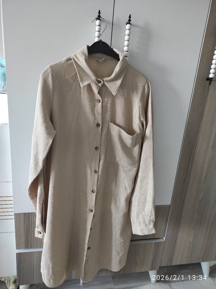 Bej keten kumaştan, uzun kollu, düğmeli ve yakalı, salaş kesim uzun kadın gömleği. Minimalist ve günlük kullanıma uygun.