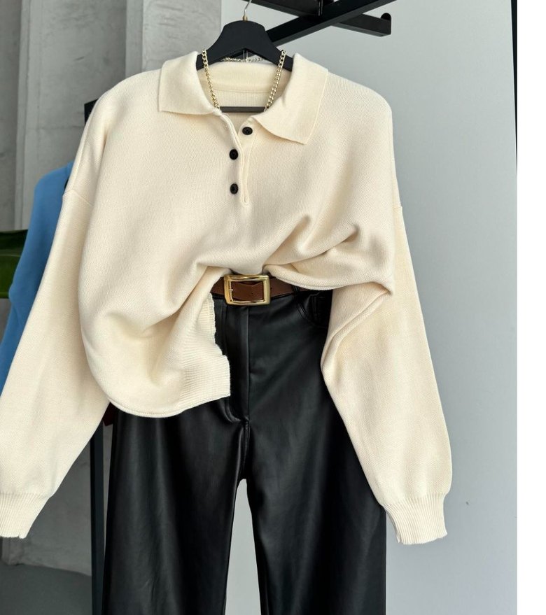 Düğmeli, uzun kollu, yakalı ve kısa kesim bej deri kadın kazak, rahat ve günlük stil için uygundur. Butikten her bedeni mevcut.