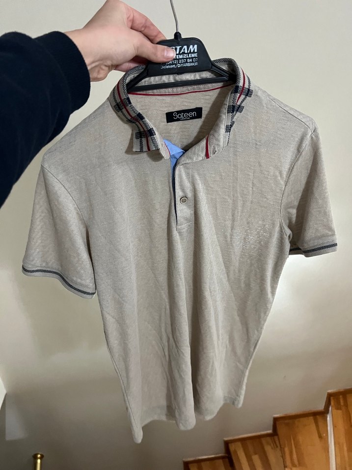 Düğmeli yakası ve kısa kolları olan bej erkek polo tişört. Yumuşak sentetik kumaştan, sade tasarımlı, rahat kesim ve günlük kullanım için uygun.