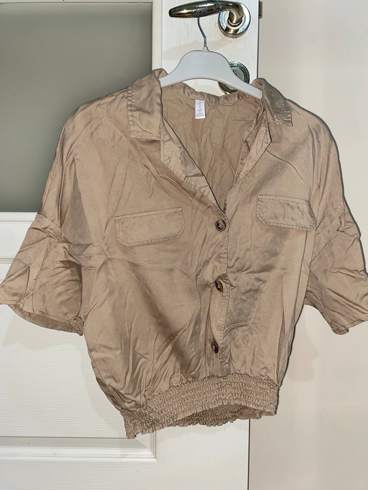 Düğmeli ön cep detaylı, kısa kollu bej keten gömlek. Yaka detaylı, kısa ve lastikli alt ucu ile rahat bir kesime sahiptir. s-m beden