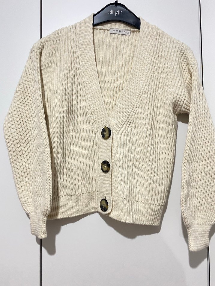 Bej renkli, düğmeli ve uzun kollu örgü hırka. Hem spor hem şık kombininize uygun sadece bir kez giydim temiz hibir deformesi yoktur
