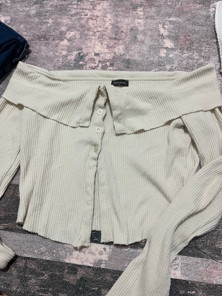 Düğmeli, uzun kollu, kayık yaka, bej renk kısa kesim ve fit kesim bluz. Yumuşak keten kumaştan, günlük rahat sokak stili için uygundur.