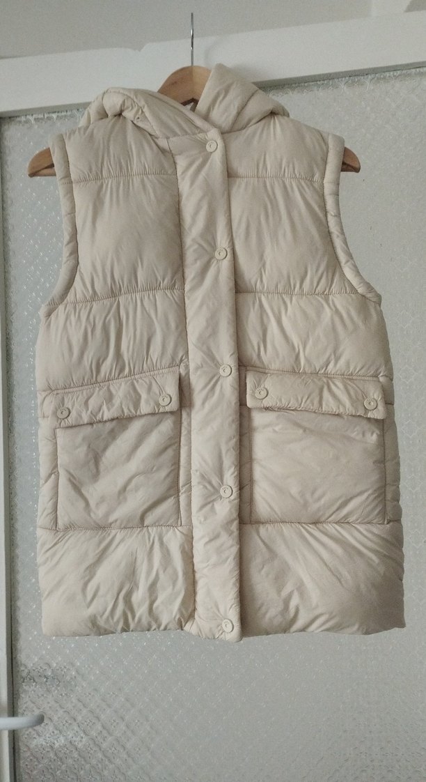 Düğmeli kapüşonlu, kolsuz bej yelek, fitted kesim ve iki ön cepleri çıt çıtlı ve ön de fermuarlı ve çıt çıtlı . Yumuşak ve sıcak kumaşıyla fermuarlı ve çıt çı günlük kullanıma uygundur.