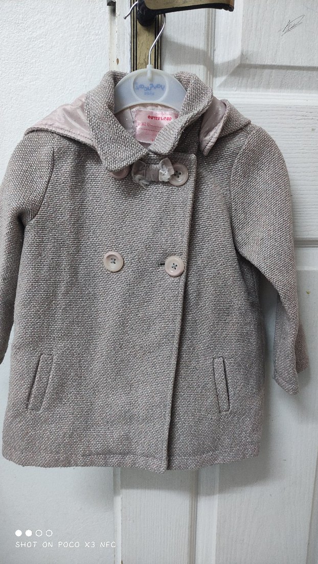 Bej renkli, düğmeli kız çocuk yün kaban. Notched lapel yakalı ve düz desensiz, regular fit kesime sahip.