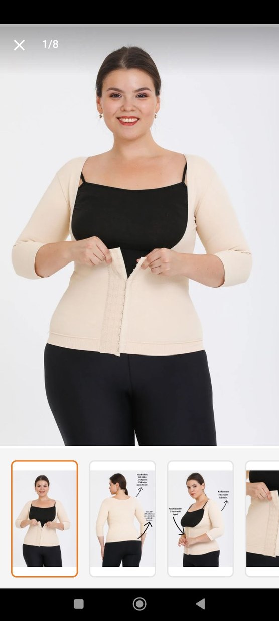 Yumuşak sentetik kumaştan, uzun kollu ve düğmeli bej göbek ve kol korsesi. Günlük kullanım için uygun, vücuda oturan kesimde.