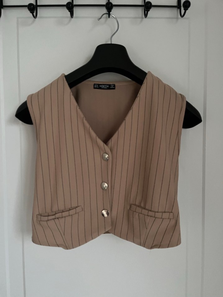 Bej renkli, düğmeli ve V yakalı kolsuz yelek. İnce gri çizgili desen ve kısa kesime sahip, rahat bir kesim sunar. Ofis için uygun şık bir parça.
