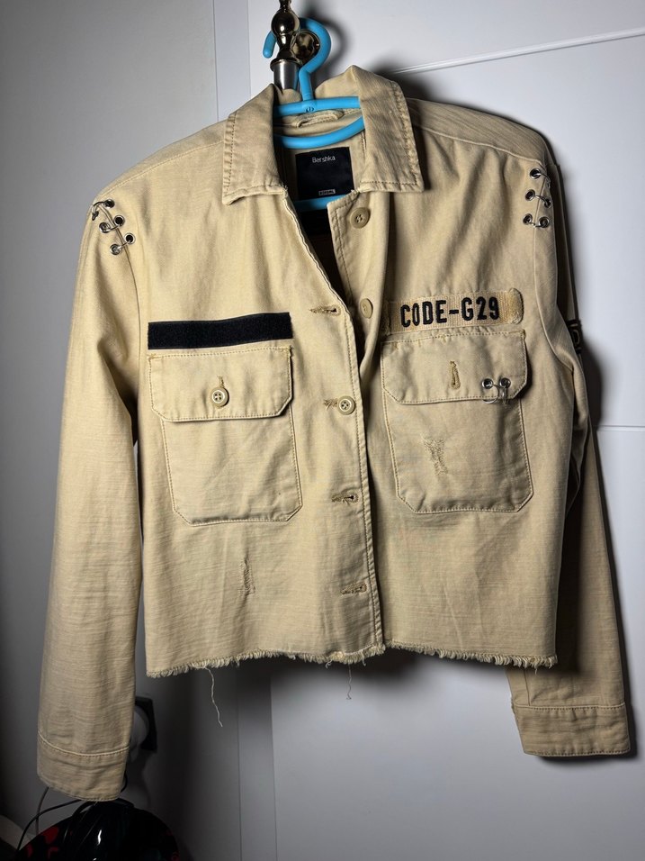 Düğmeli, bej renkli kot ceket, mini kısa kesim ve bol fit. Uzun kollu, baskılı detaylı, cepli, yırtık uçlu, "CODE-G29" baskılı.