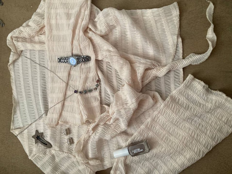 Düğmeli, bol kesim bej keten bluz, bohem tarzda ve midi boyda. Yumuşak, pastel renkli desensiz kumaş.
