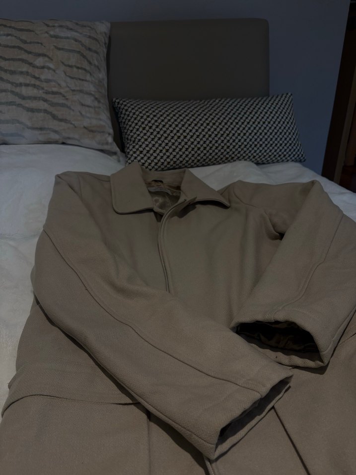 Bej renkte, düğmeli ve normal boy midi ceket. Uzun kollu, notched lapel yakalı ve rahat kesimdir. Günlük ve sokak stiline uygundur. İç astarı birazcık yırtık dışı hasarsız