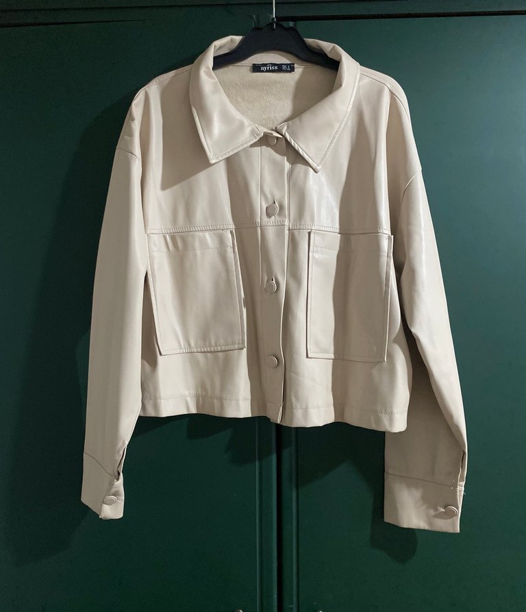 Bej renkli deri ceket, düğmeli ve yakalıdır. Uzun kollu, normal kesim ve midi boydadır. Günlük kullanıma uygundur.
