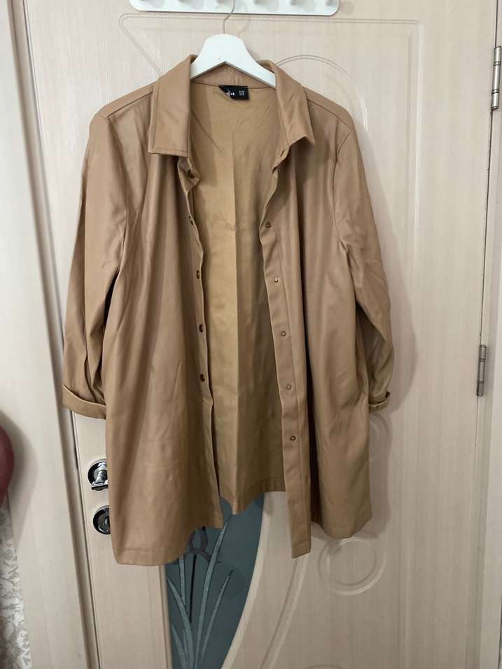 Bej renkli, parlak deri kadın ceket. Uzun kollu, kesik yaka ve düğmeli. Rahat kalıp, günlük sokak stili için uygun.