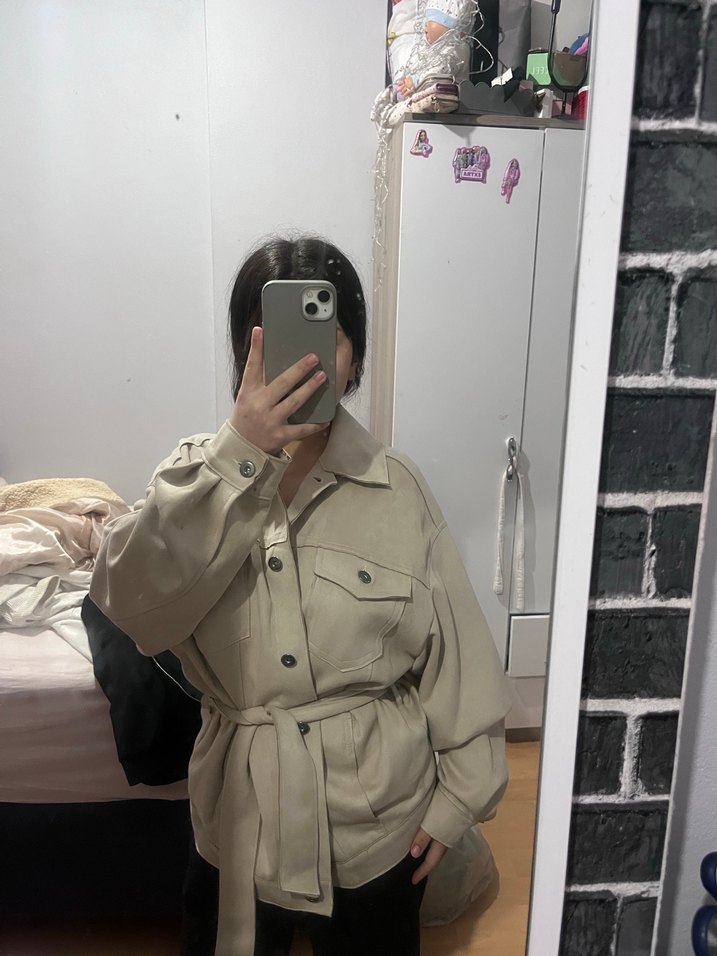 Düğmeli ve kuşaklı, bej renkli deri kadın kaban. Normal uzunlukta, bol kesim, keskin yakalı ve uzun kollu, minimalist tarzda gündelik kullanım için uygun.