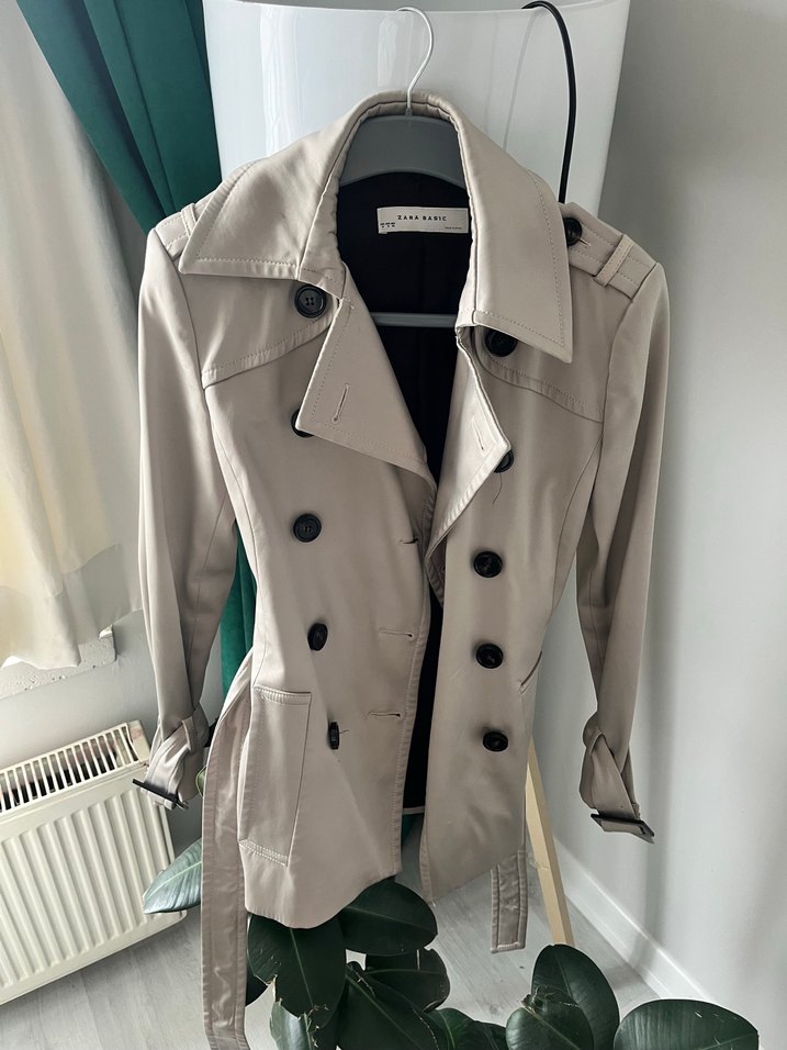 Bej renkli deri trençkot, düğmeli ön, notched yaka ve uzun kollu. Regular fit ve midi boyda, günlük şık sokak stili için uygundur.