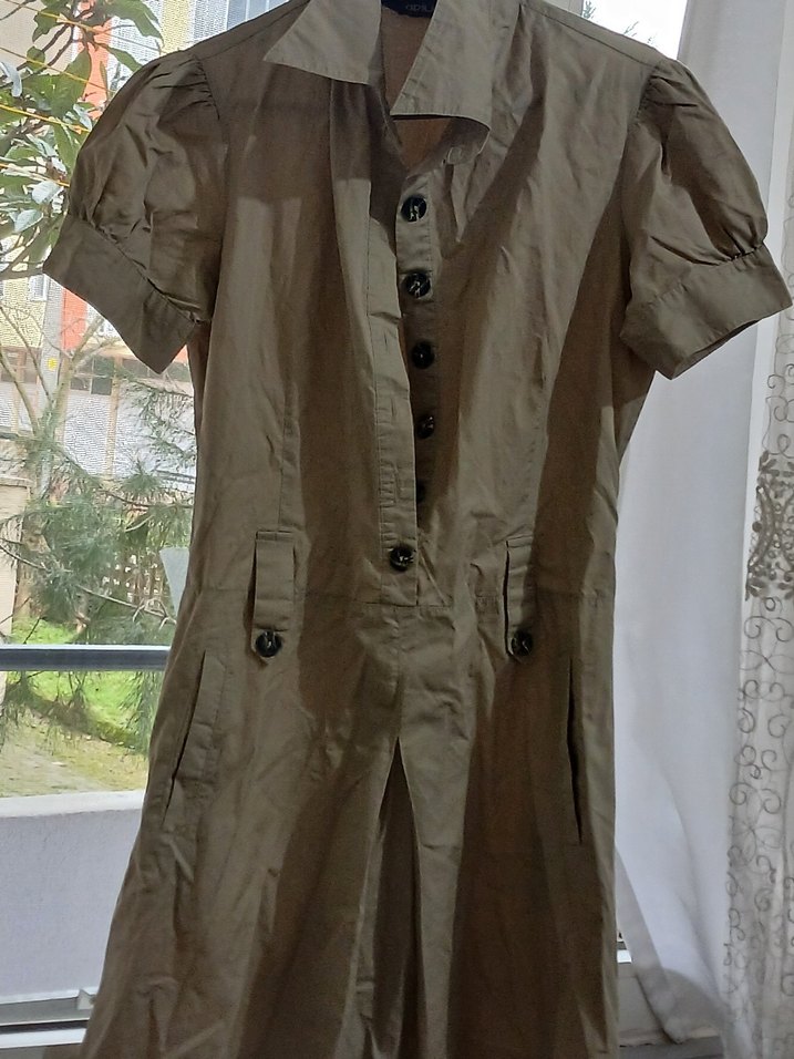 Bej renkte, düğmeli ve kısa kollu midi elbisedir. Notlu yaka ve bol kesimiyle rahat bir kullanım sunar. Yumuşak keten kumaştan, günlük sokak stili için uygundur.