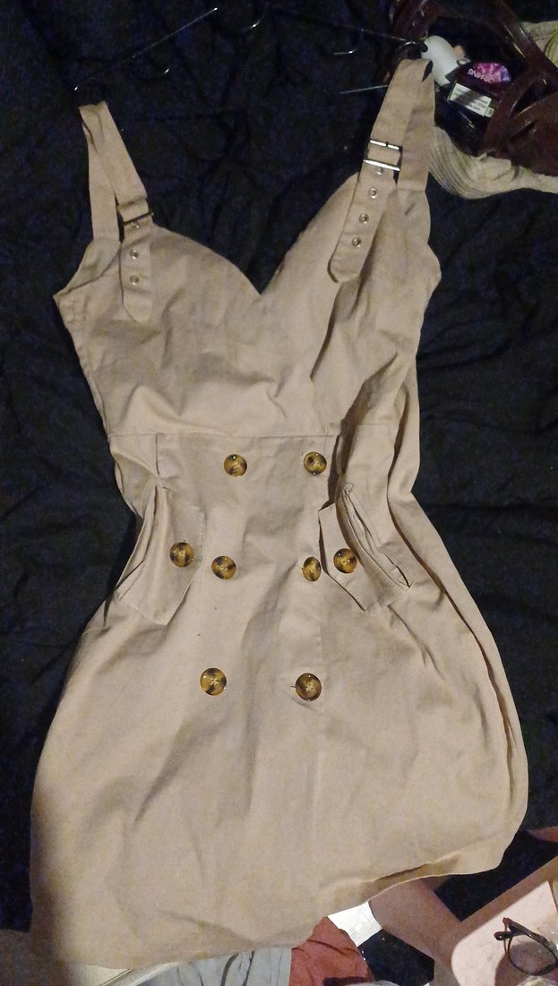 Düğmeli ön yüzü ve kesimli yakası olan, bej renkli, kolsuz ve sentetik kumaştan midi boy, vücuda oturan elbise. Vintage sokak tarzına uygun annemin elbisesi o da cok giymemis temizdir s giyiyorum bana bol oluyor s m arasi sanirim