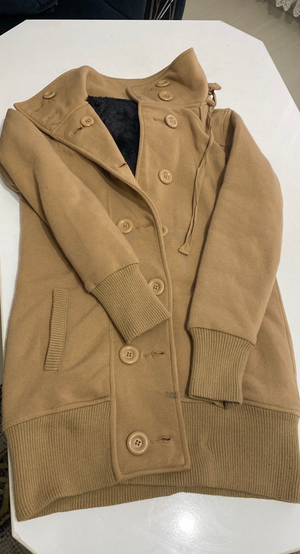 Düğmeli, kapşonlu ,notalı yaka ve uzun kollu bej kaban. Yumuşak ve sıcak kumaştan, midi boyda, günlük rahat kullanım için uygun. Dar kalıp s ve m beden de giyebilir hafif tüylenme var o yüzden makül fiyat