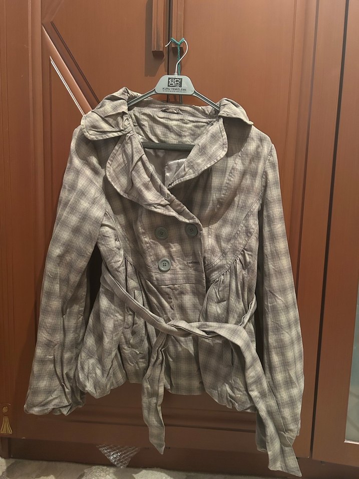 Bej kaban, düğmeli ön, kesimli yaka ve uzun kolludur. Salaş kesim, bağlamalı ve hafif batik desenlidir, günlük kullanıma uygundur.